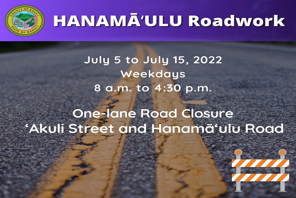 HANAMĀʻULU – The Department of Public Works and Goodfellow Bros. LLC., are announcing that sections of ‘Akuli Street and Hanamāʻulu Road will be under short lane closures from July 5 to July 15, on weekdays, from 8 a.m. to 4:30 p.m.
